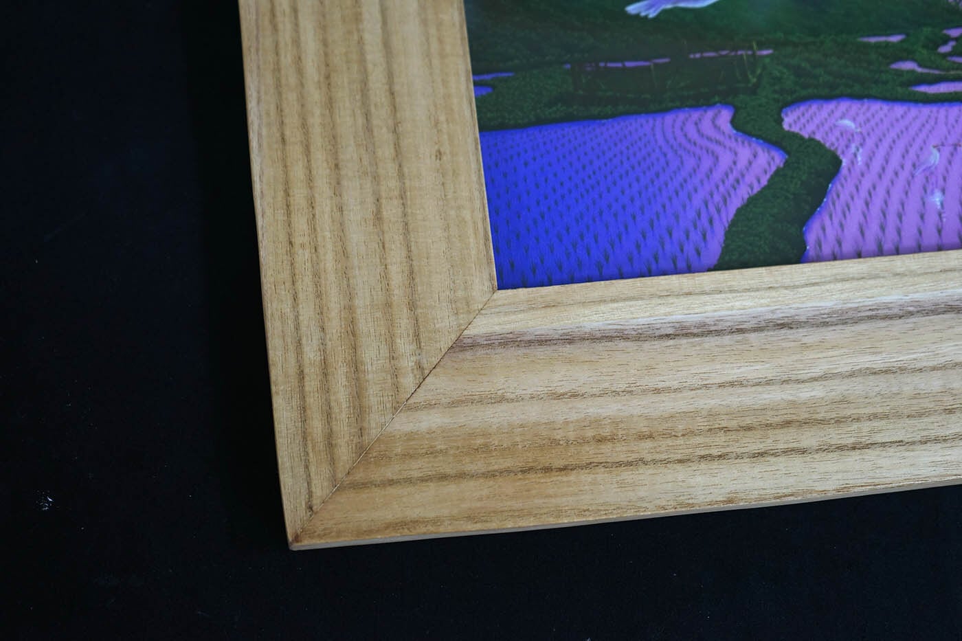 額は温かみのある桐の木を使って1つ1つ作品に合わせて画家が自ら制作します。額には作品を保護するアクリルカバーも付きます。