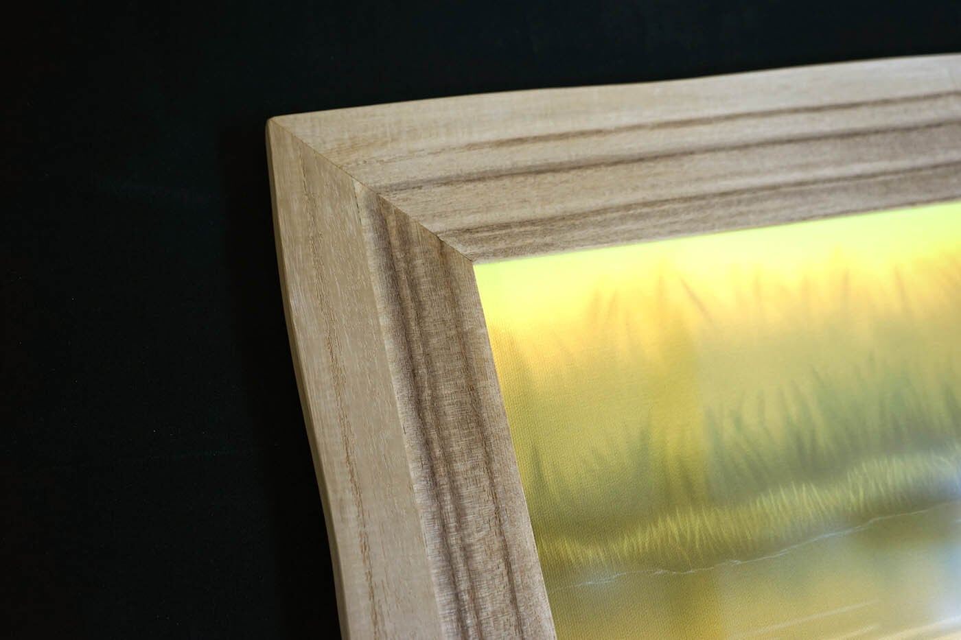 額は温かみのある桐の木を使って1つ1つ作品に合わせて画家が自ら制作します。額には作品を保護するアクリルカバーも付きます。(※原画に使う天然の一枚板とは違い、版画には継ぎ目がある合わせ使うことで価格を抑えています)