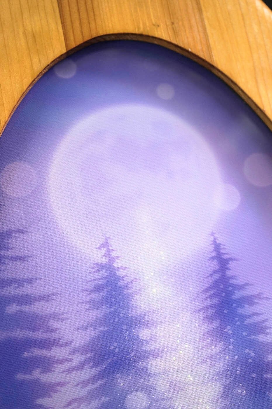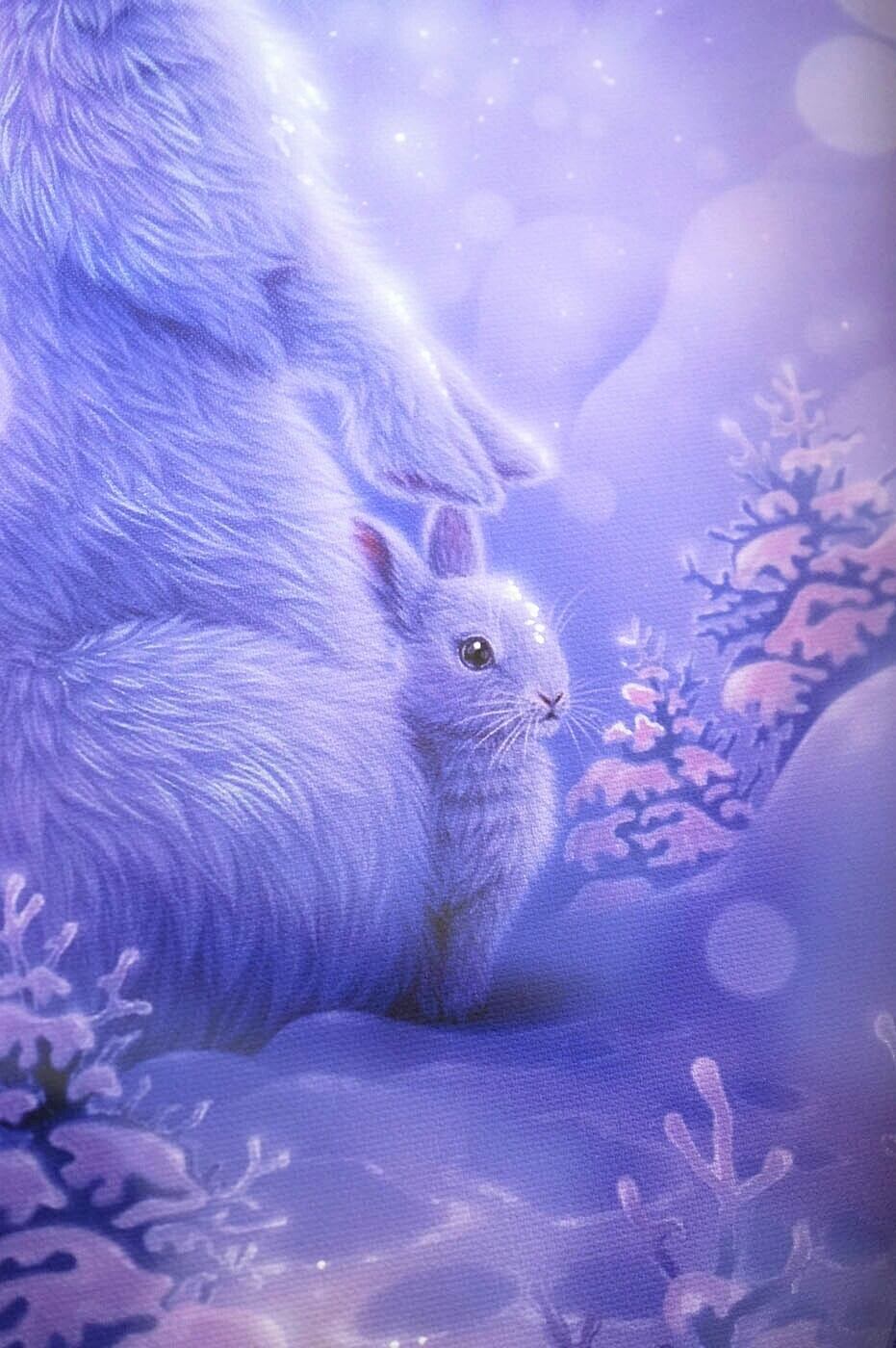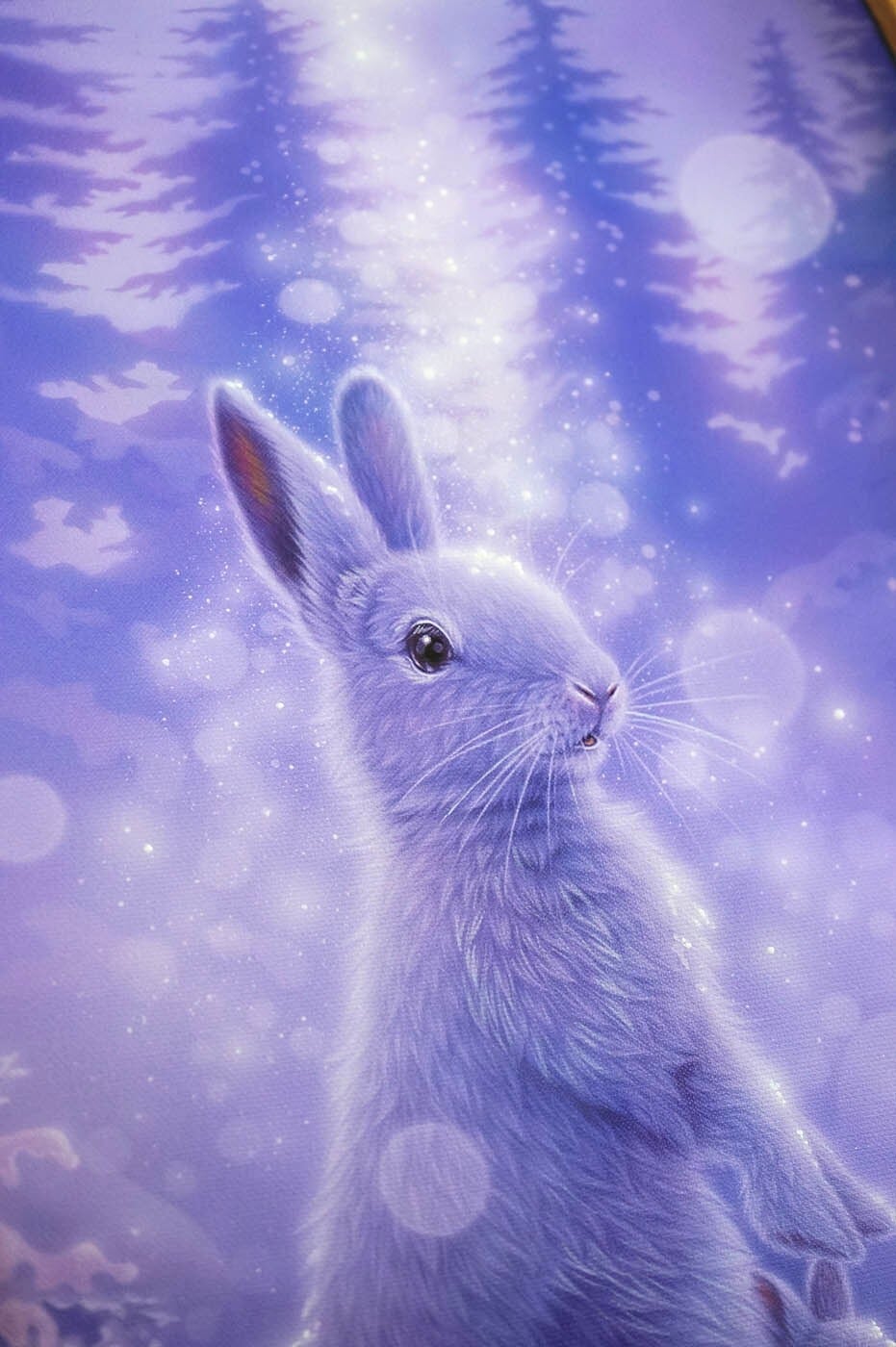 月光の森の中で、親子ウサギがこちらを振り返る様子を描いた作品です。
