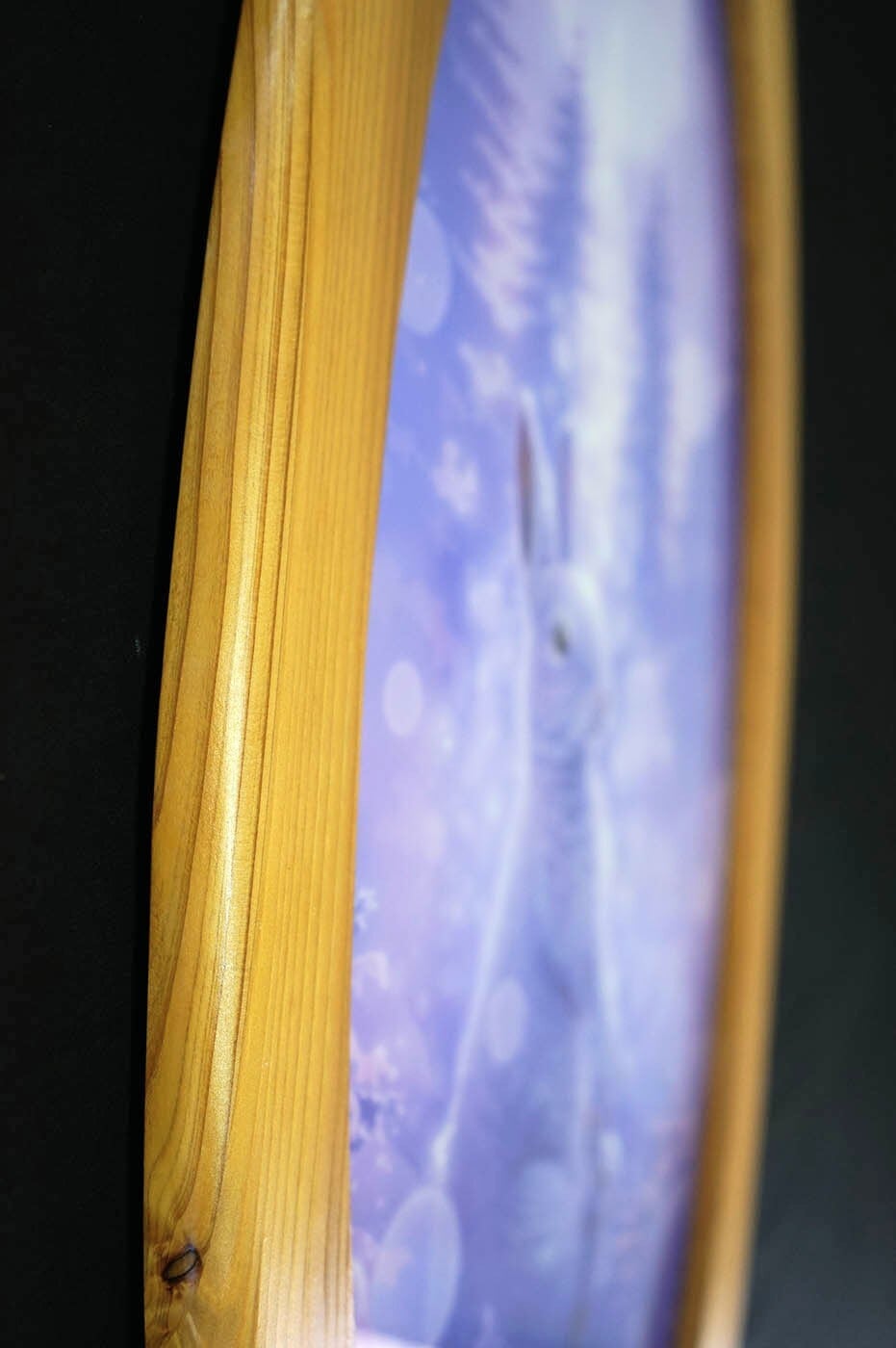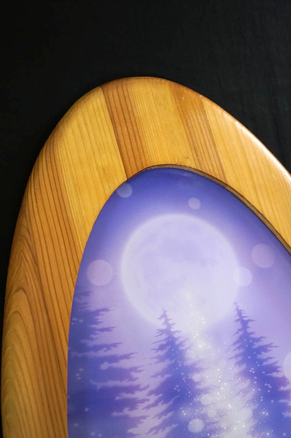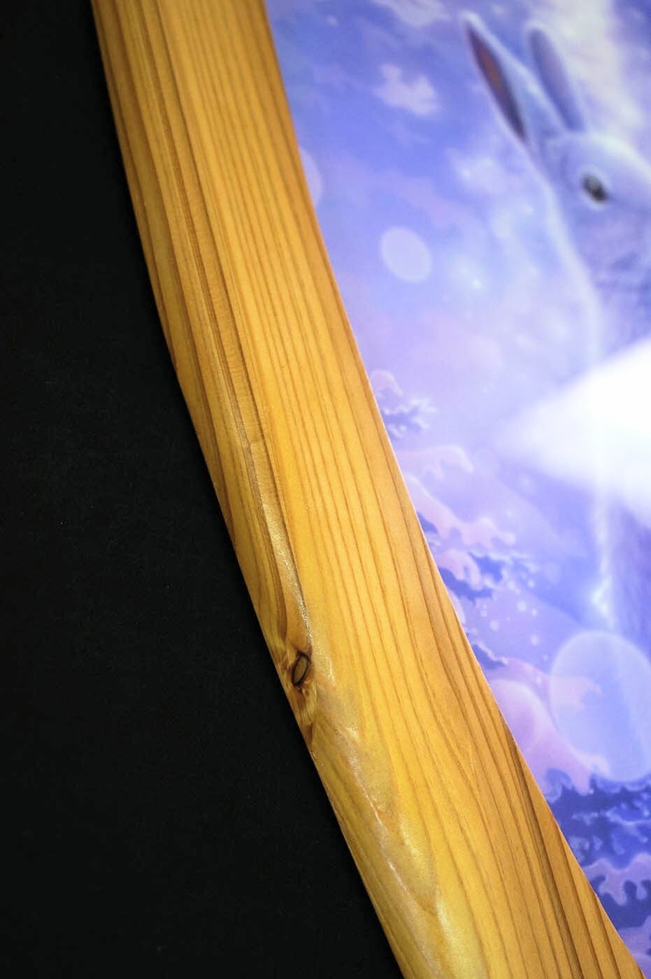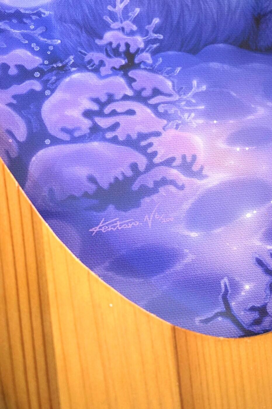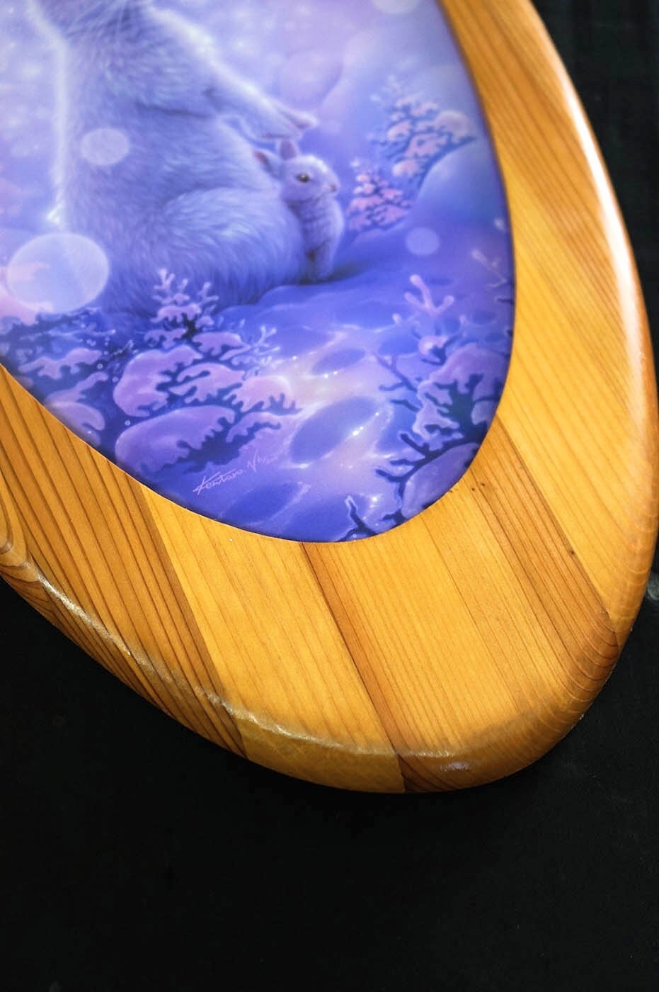 額には温かみのある桐の木を使って、1つ1つ作品に合わせて画家が自ら制作します。額には作品を保護するアクリルカバーも付きます。(※原画に使う天然の一枚板とは違い、複製画には継ぎ目がある合わせ板を使うことで価格を抑えています)