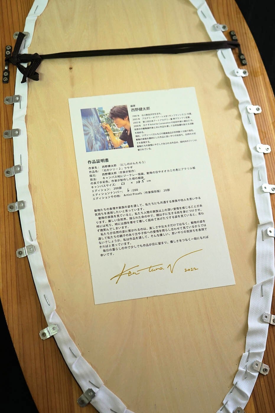 画家自らが原画を元に限定部数で複製したキャンバスに、動物の目や背景に直筆、絵の具で光や色を手描き加えます。
