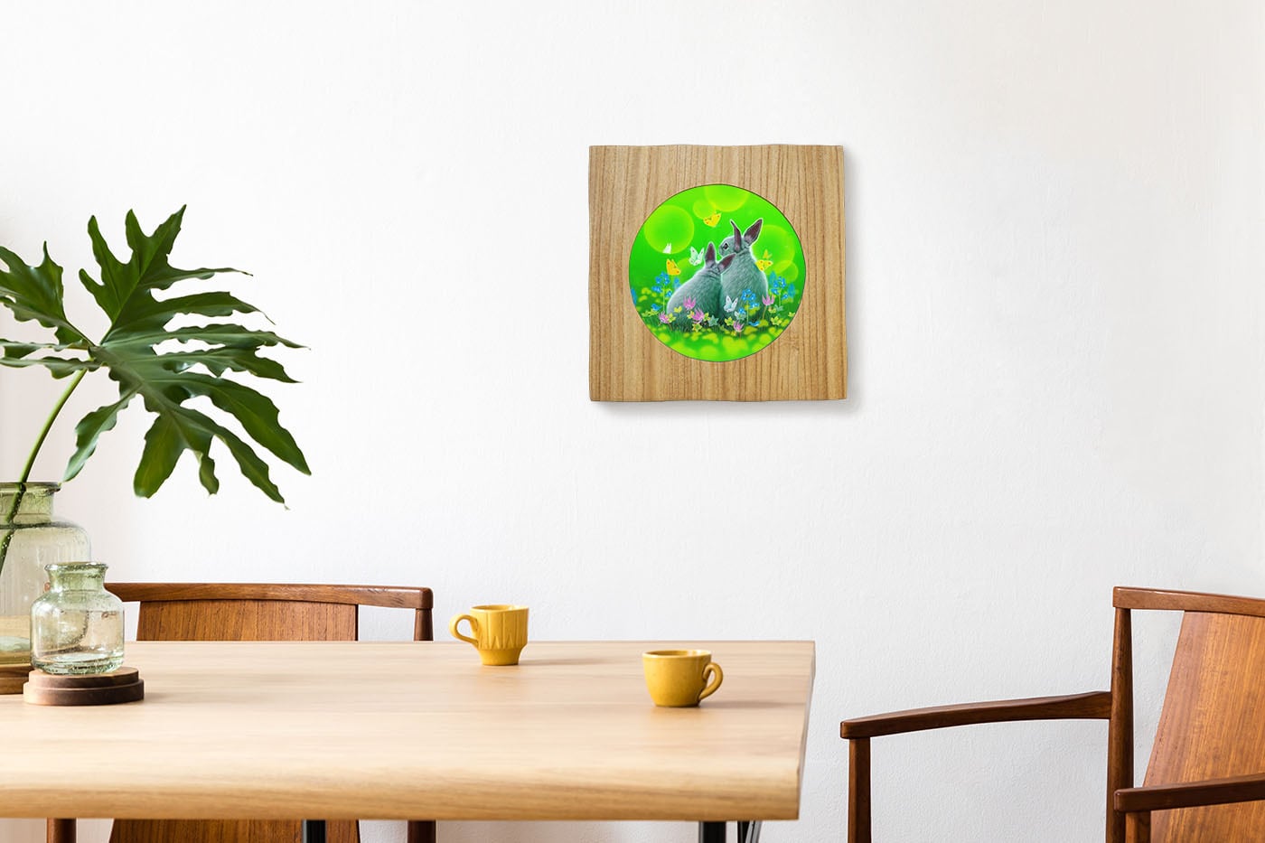 春の花畑の中でなかよく寄り添う2羽のウサギを描いた作品です。