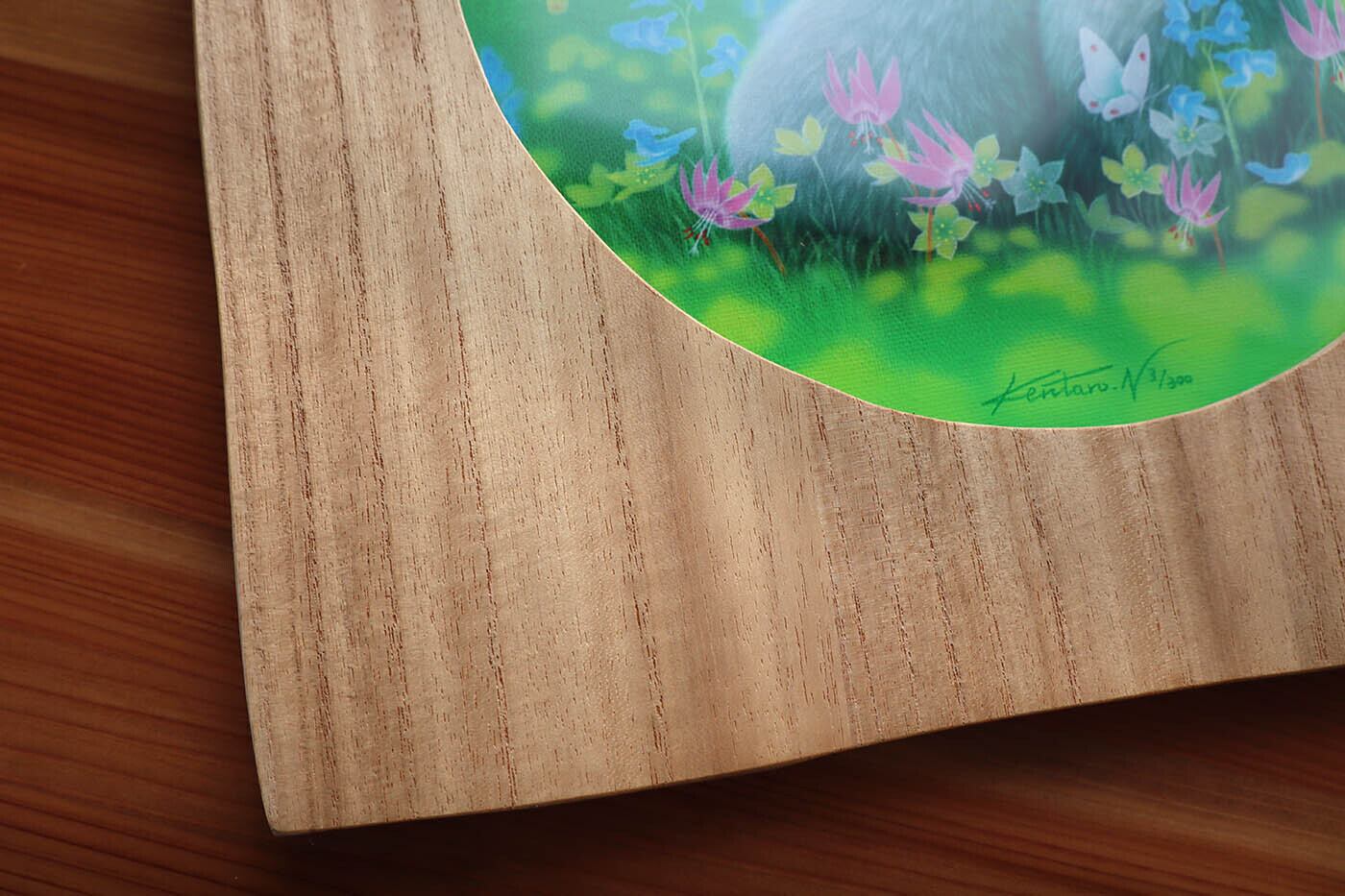 額には温かみのある桐の木を使って、1つ1つ作品に合わせて画家が自ら制作します。額には作品を保護するアクリルカバーも付きます。(※原画に使う天然の一枚板とは違い、複製画には継ぎ目がある合わせ板を使うことで価格を抑えています)