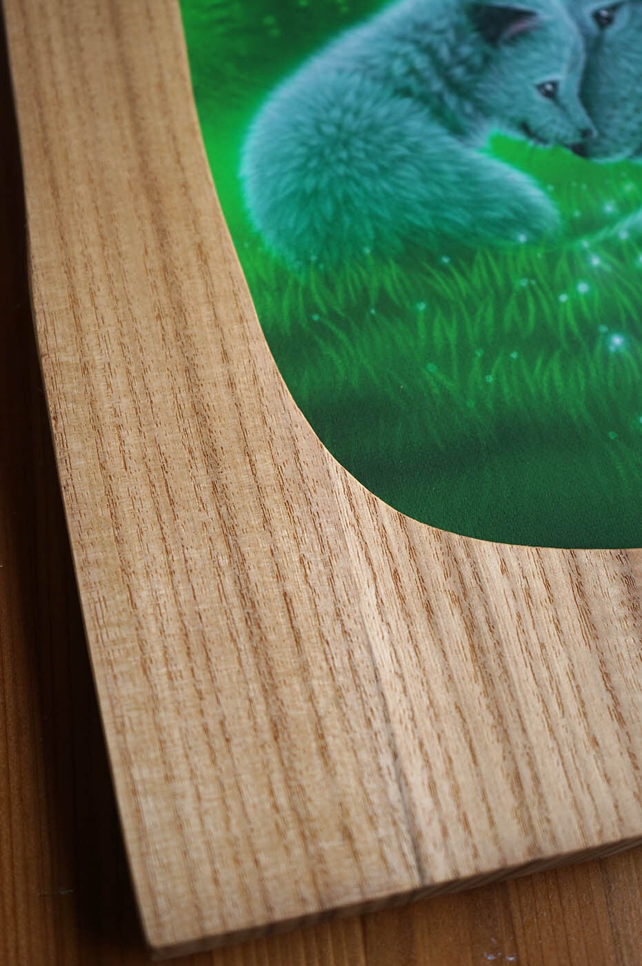 額には温かみのある桐の木を使って、1つ1つ作品に合わせて画家が自ら制作します。額には作品を保護するアクリルカバーも付きます。(※原画に使う天然の一枚板とは違い、複製画には継ぎ目がある合わせ板を使うことで価格を抑えています)