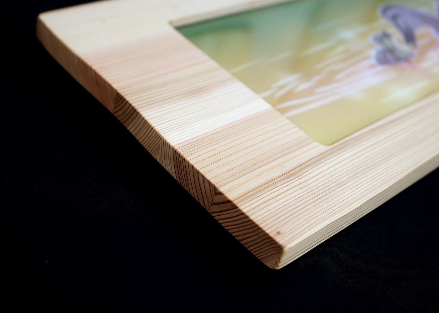 額には水辺に合わせた爽やかな色合いの杉の木を使って、1つ1つ作品に合わせて画家が自ら制作します。額には作品を保護するアクリルカバーも付きます。(※原画に使う天然の一枚板とは違い、版画には継ぎ目がある合わせ使うことで価格を抑えています)