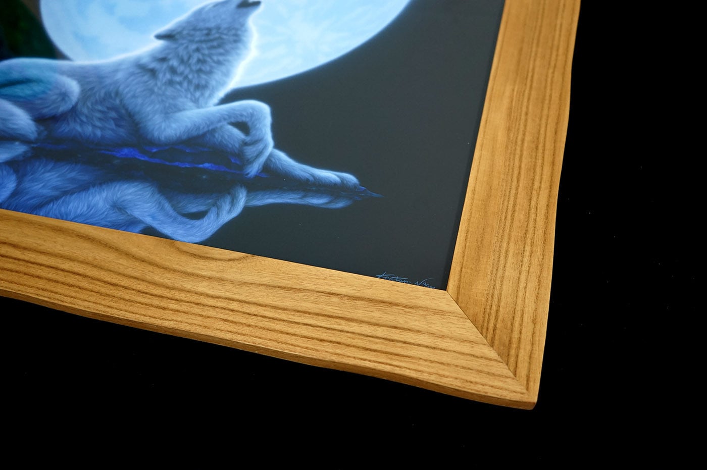 額は温かみのある桐の木を使って1つ1つ作品に合わせて画家が自ら制作します。額には作品を保護するアクリルカバーも付きます。(※原画に使う天然の一枚板とは違い、版画には継ぎ目がある合わせ使うことで価格を抑えています)