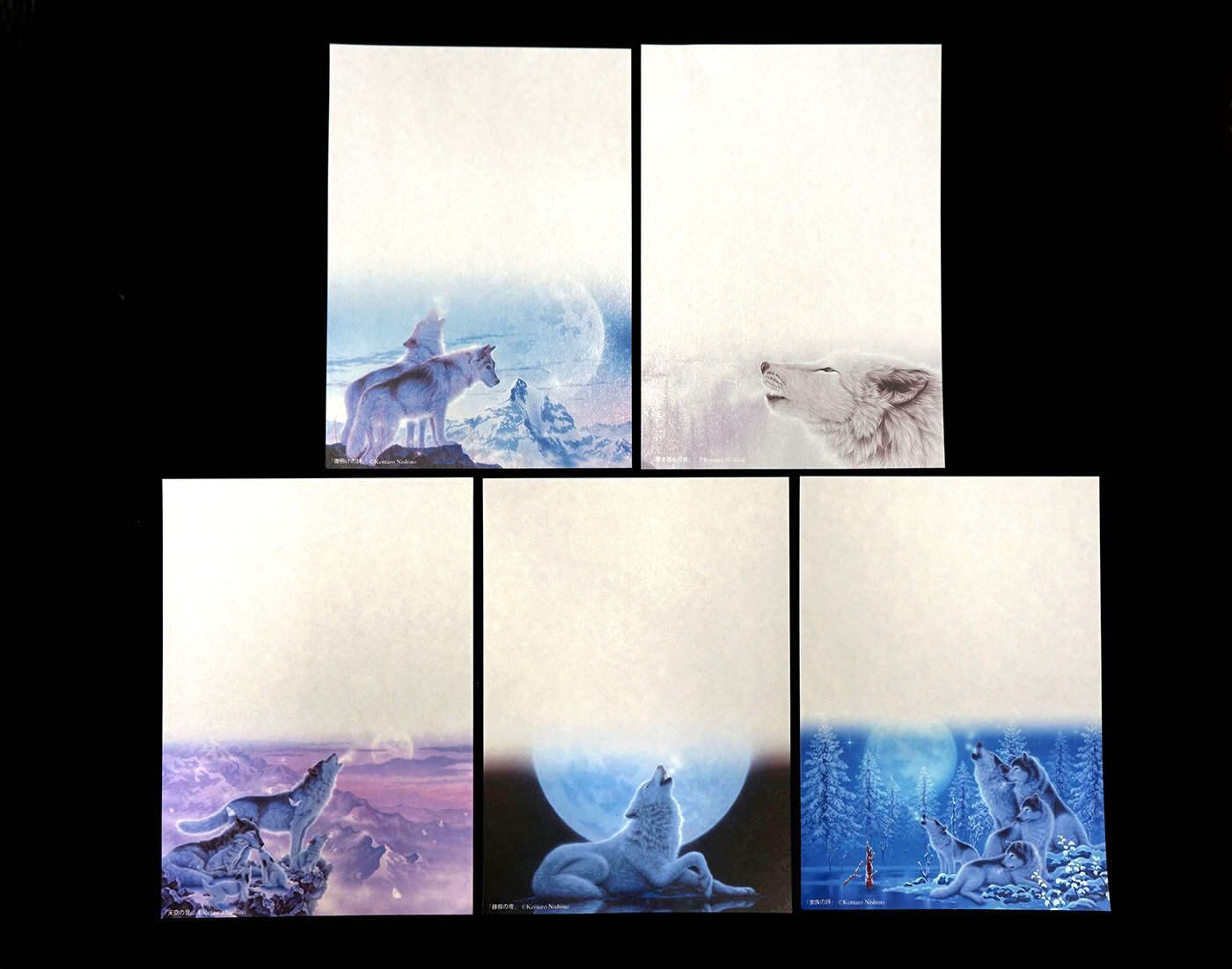 用紙サイズ : 縦24×横17cm オオカミの絵柄を5種類、各2枚づつを入れた新シリーズの便箋10枚セットです(封筒はありません)。 温かみのある和紙を使い、動物たちの暖かさを表現しています。 ※ 和紙の性質上、紙に模様などがある場合がございますのでご了承ください。
