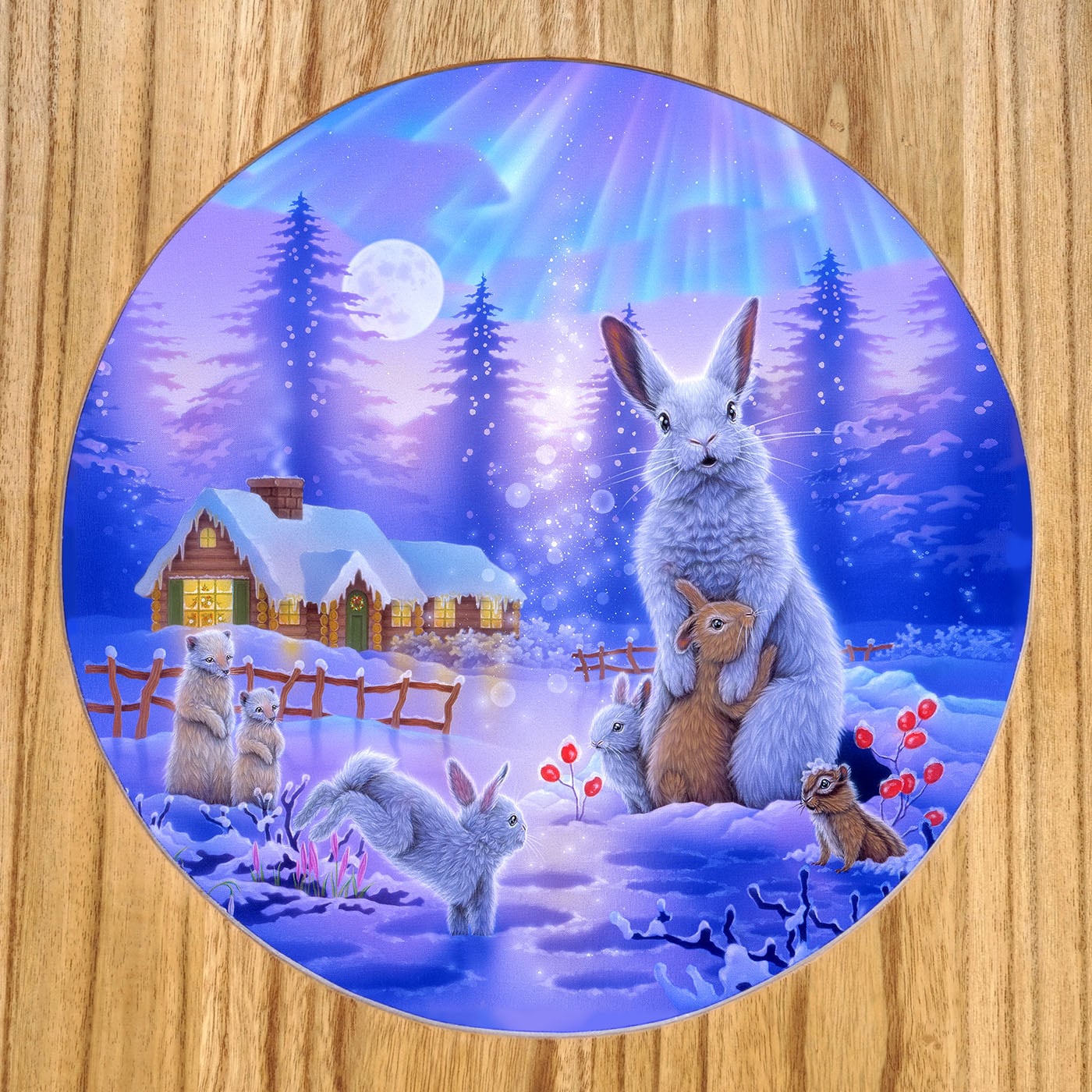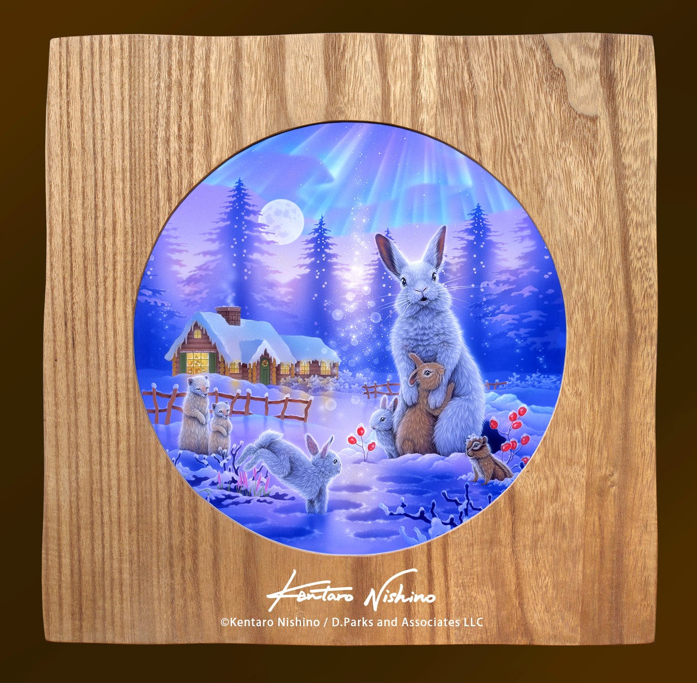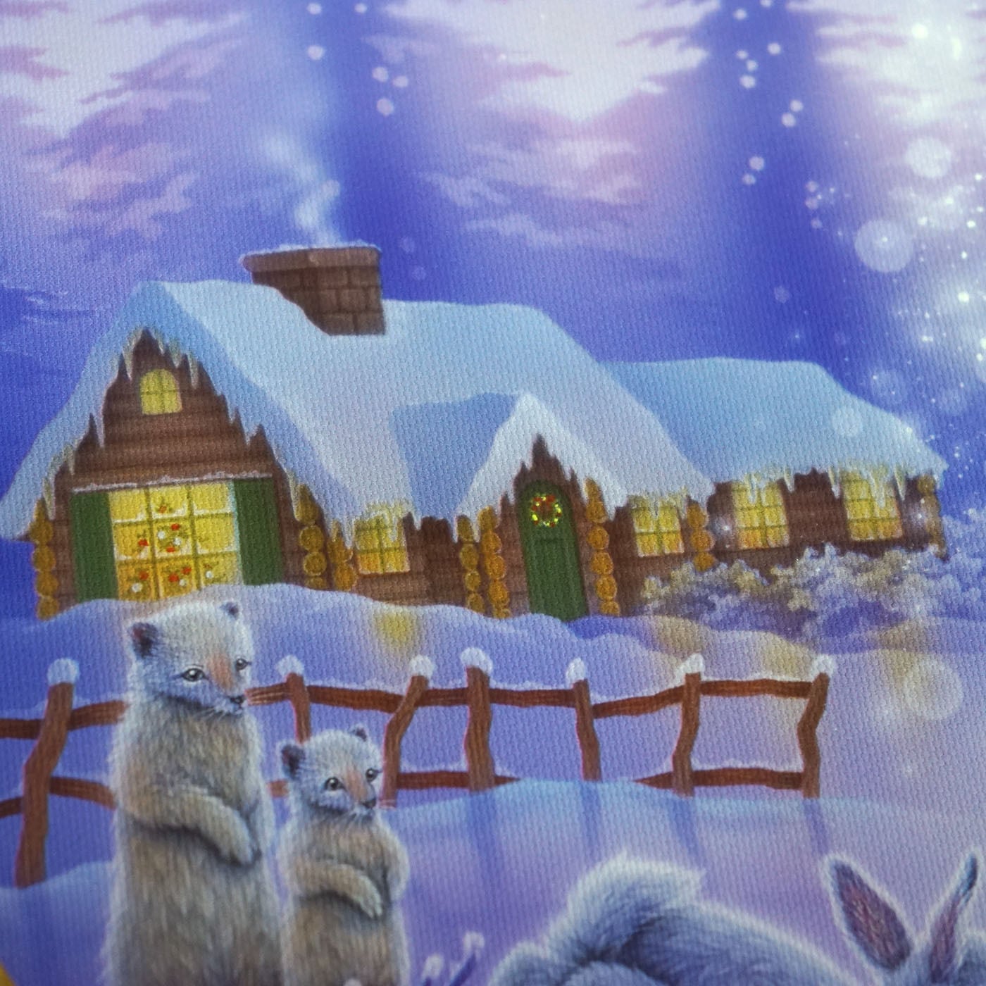 クリスマスの明かりが灯る小屋のそばで、家族で過ごす動物たちの世界を描いた作品です。