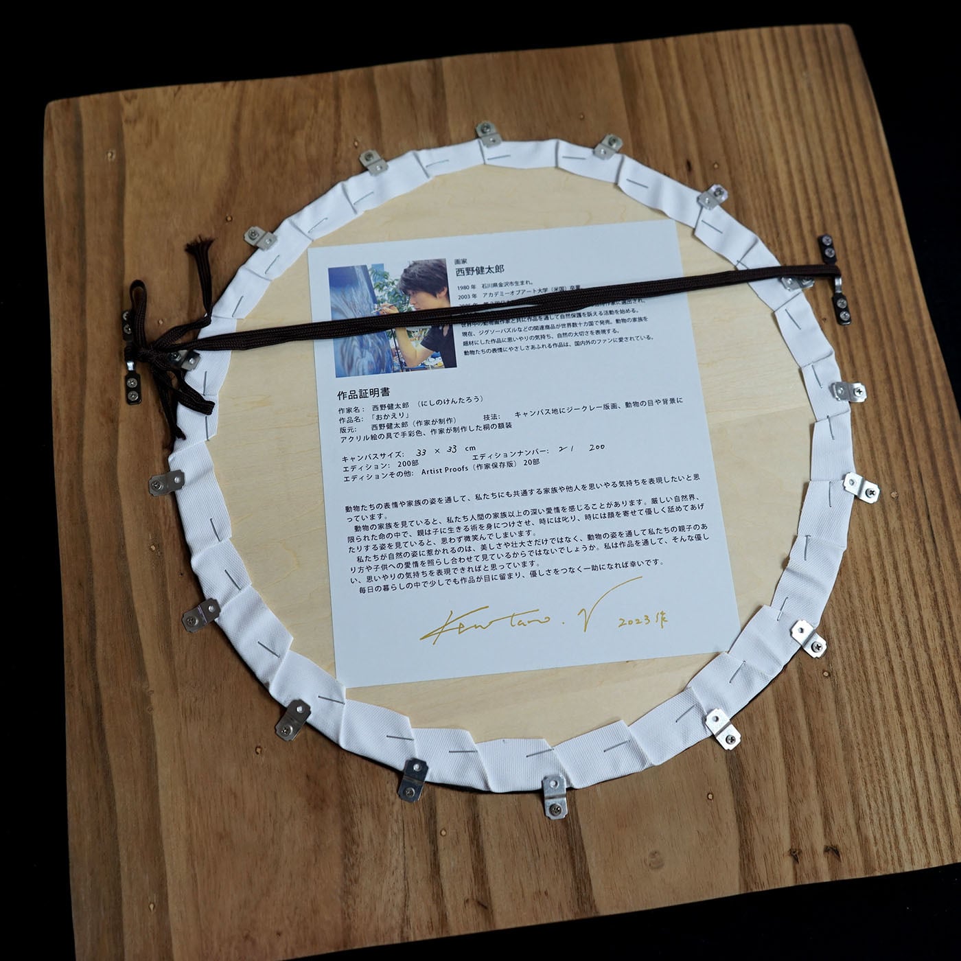 画家自らが原画を元に限定部数で複製したキャンバスに、動物の目や背景に直筆、絵の具で光や色を手描き加えます。