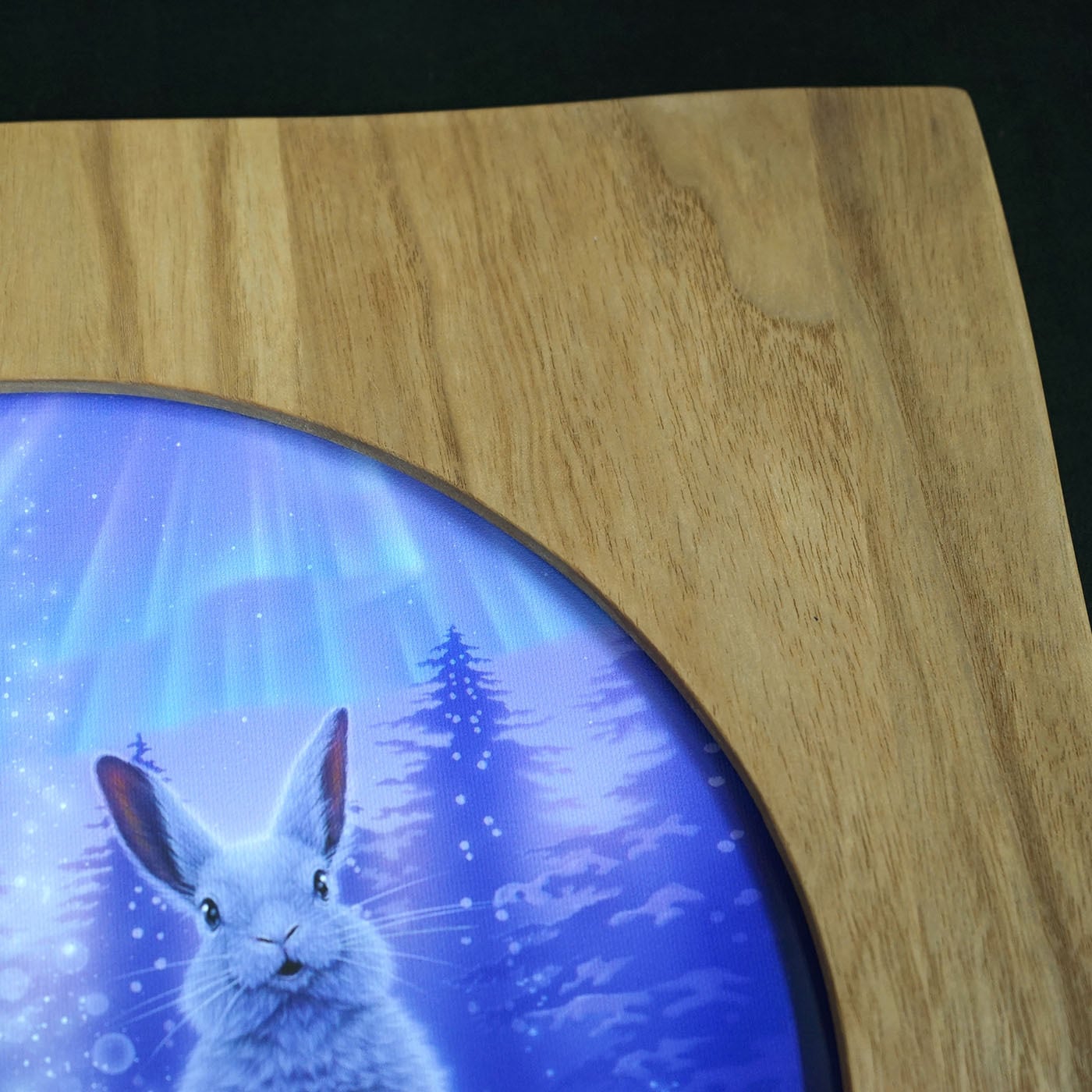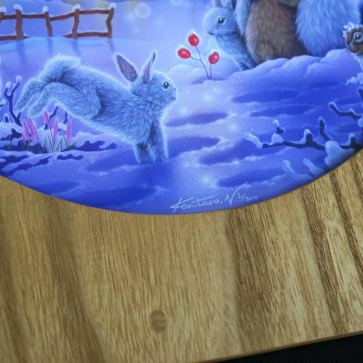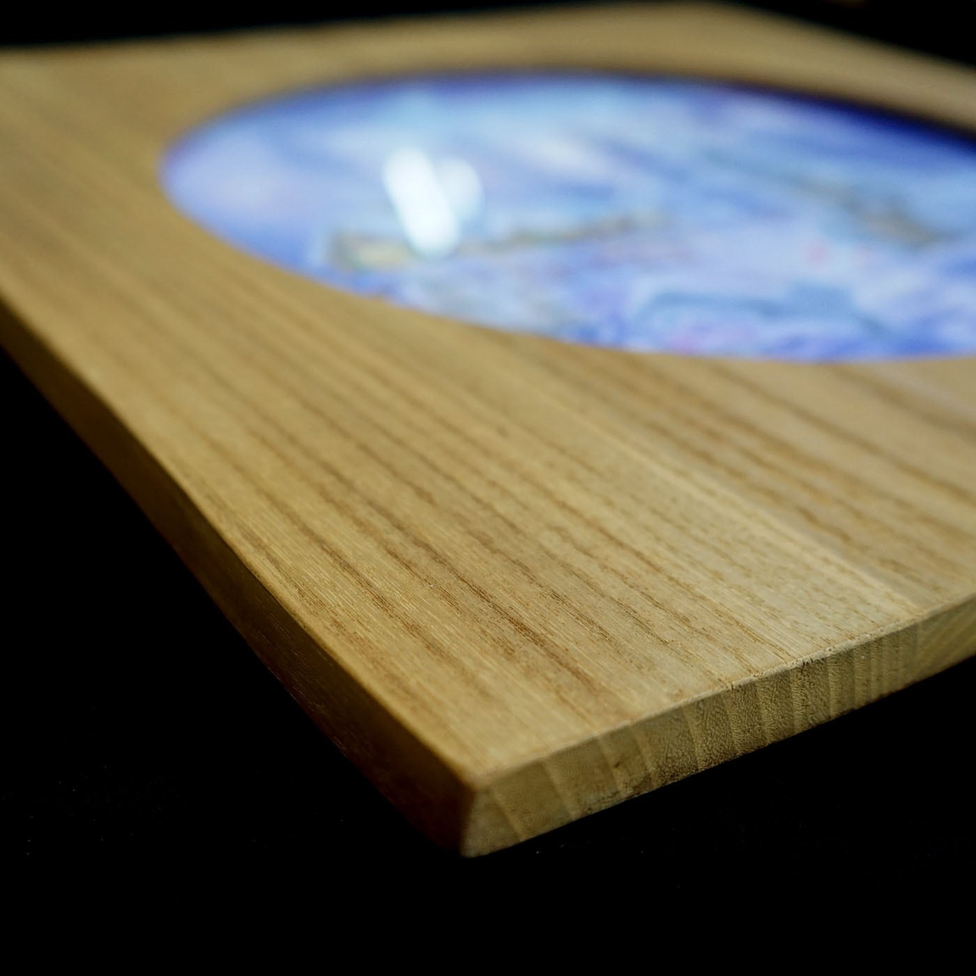 額には温かみのある桐の木を使って、1つ1つ作品に合わせて画家が自ら制作します。額には作品を保護するアクリルカバーも付きます。(※原画に使う天然の一枚板とは違い、複製画には継ぎ目がある合わせ板を使うことで価格を抑えています)